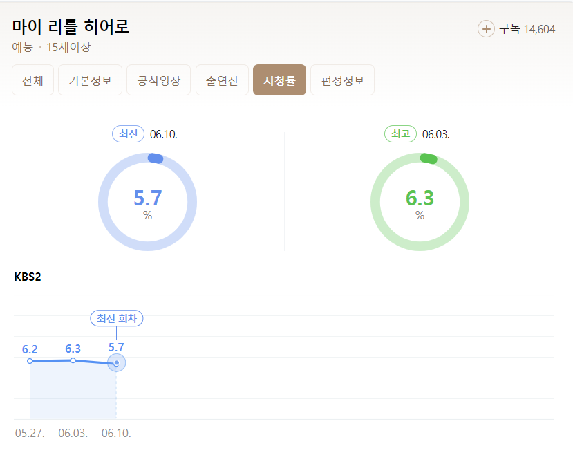 마이리틀 히어로는 임영웅의 인기로 6%대 시청률을 유지하고 있습니다.